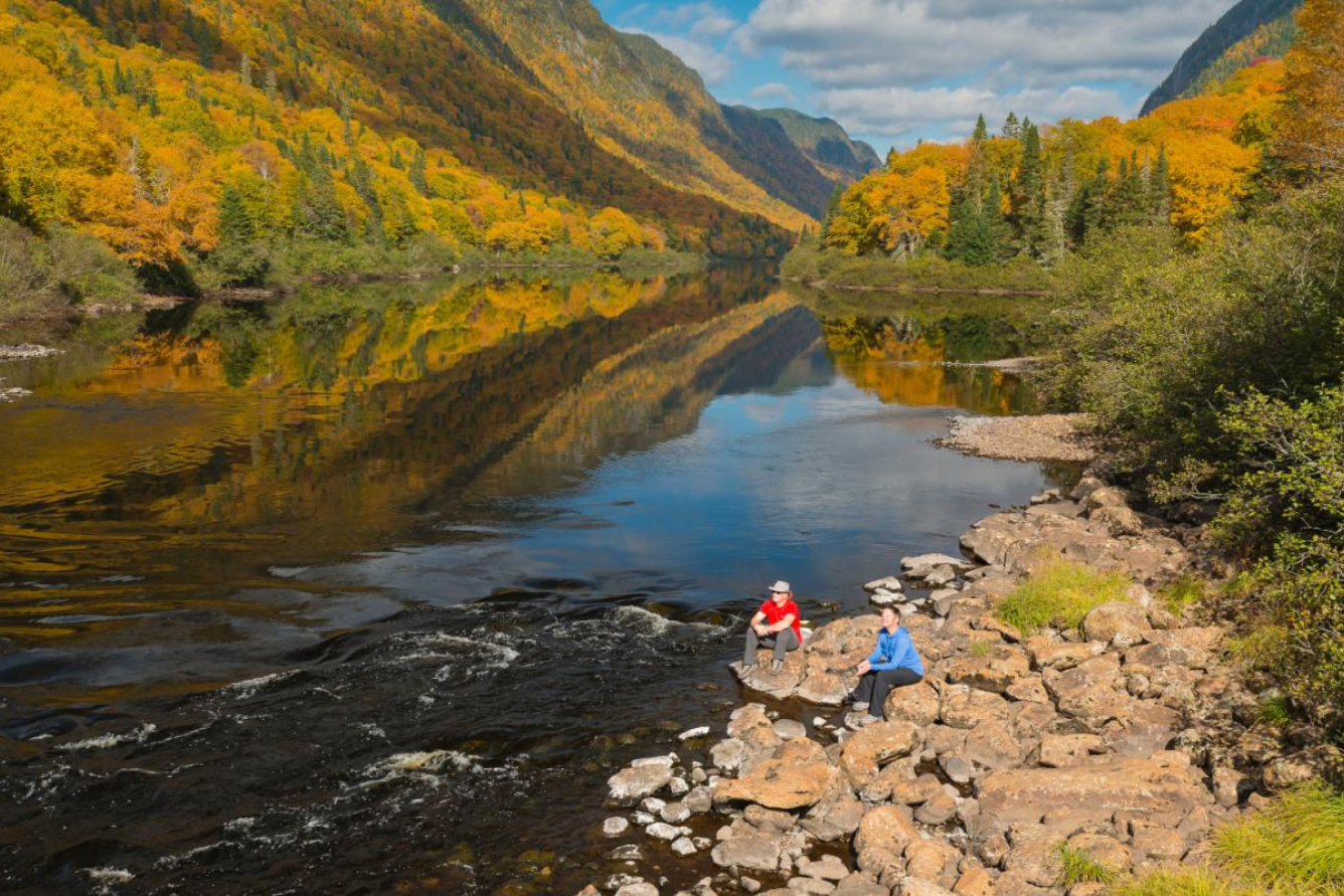 Khu vực Parc National de la Jacques-Cartier là một trong những điểm đến nổi bật. Con đường mòn len lỏi giữa thung lũng sâu, nơi dòng sông Jacques-Cartier xanh biếc uốn quanh rừng lá đỏ. Tại đây, việc đi bộ xuyên rừng lá đỏ ở Quebec mang lại cảm giác vừa hùng vĩ vừa lãng mạn, khi sắc lá soi bóng trên mặt nước.