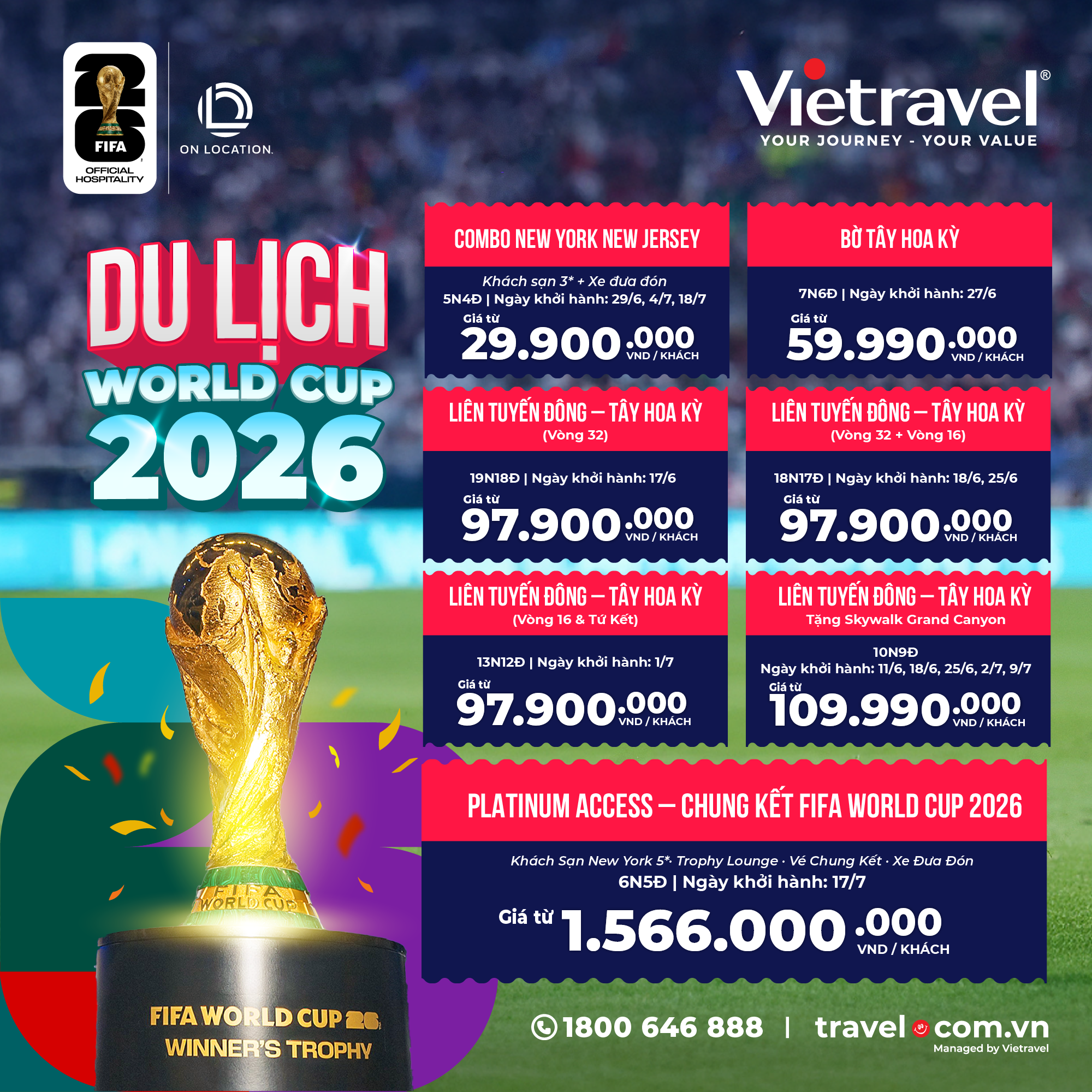 Hành trình đến Bắc Mỹ là một chặng đường dài với sự chênh lệch múi giờ và khác biệt văn hóa. Vietravel không chỉ bán vé xem World Cup 2026, chúng tôi bán sự an tâm. Đội ngũ nhân viên hỗ trợ của Vietravel sẽ túc trực 24/7 để giải quyết mọi vấn đề phát sinh của khách hàng. Khách hàng VIP sở hữu các gói Hospitality còn được hưởng dịch vụ đưa đón riêng và lối đi ưu tiên, đảm bảo trải nghiệm suôn sẻ từ khi rời khách sạn đến khi kết thúc trận đấu.Nếu bạn đang tìm kiếm một trải nghiệm World Cup 2026 trọn vẹn, tham khảo ngay tại đây: https://fifaworldcuphospitality.vietravel.com