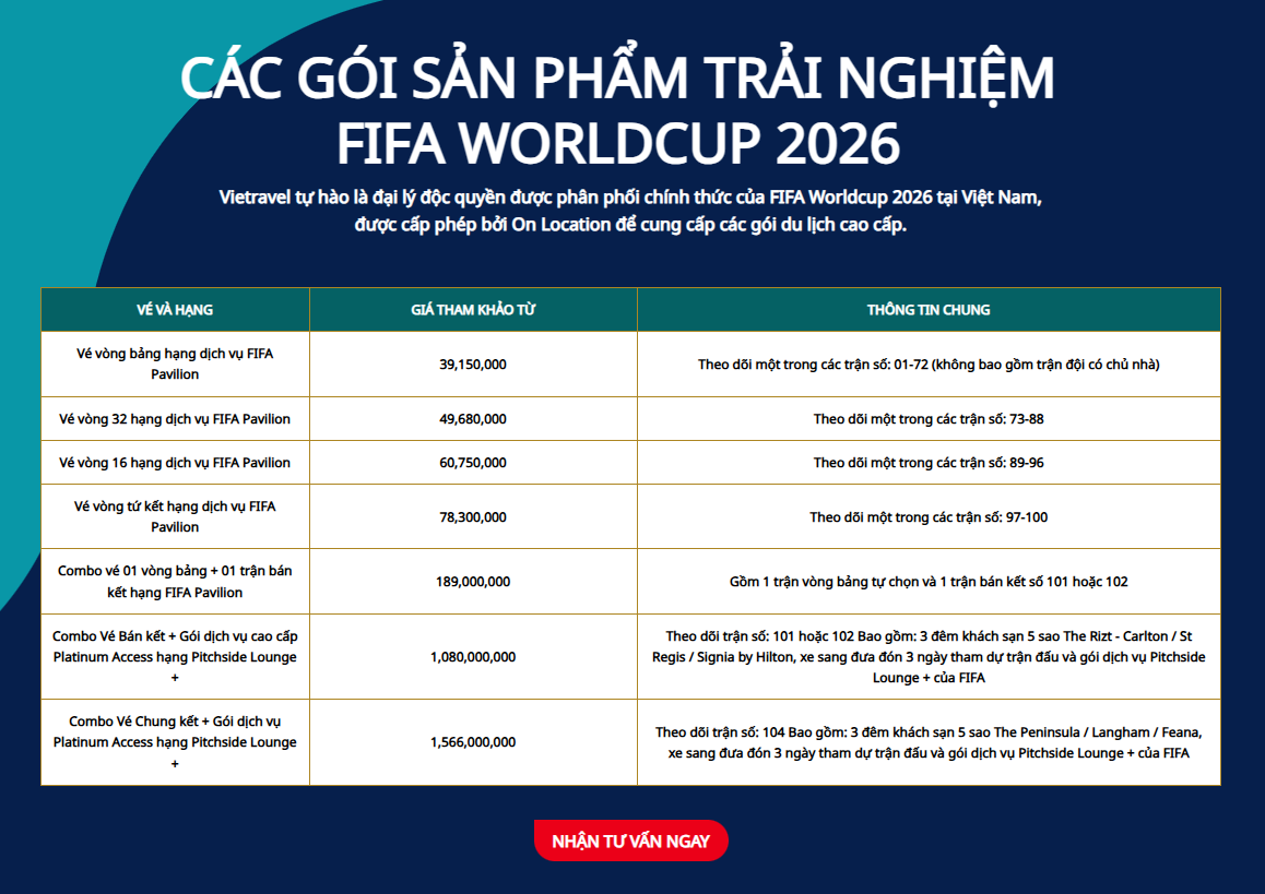 Tại đây, quý khách sẽ được cung cấp thông tin chi tiết về các trận đấu, sơ đồ chỗ ngồi, thực đơn ẩm thực, các đặc quyền đi kèm và báo giá minh bạch của từng hạng vé xem World Cup 2026.