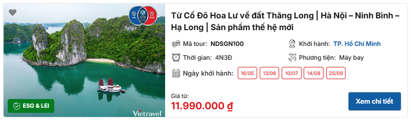 - Khu vực nổi bật: phố cổ Hà Nội, Vịnh Hạ Long