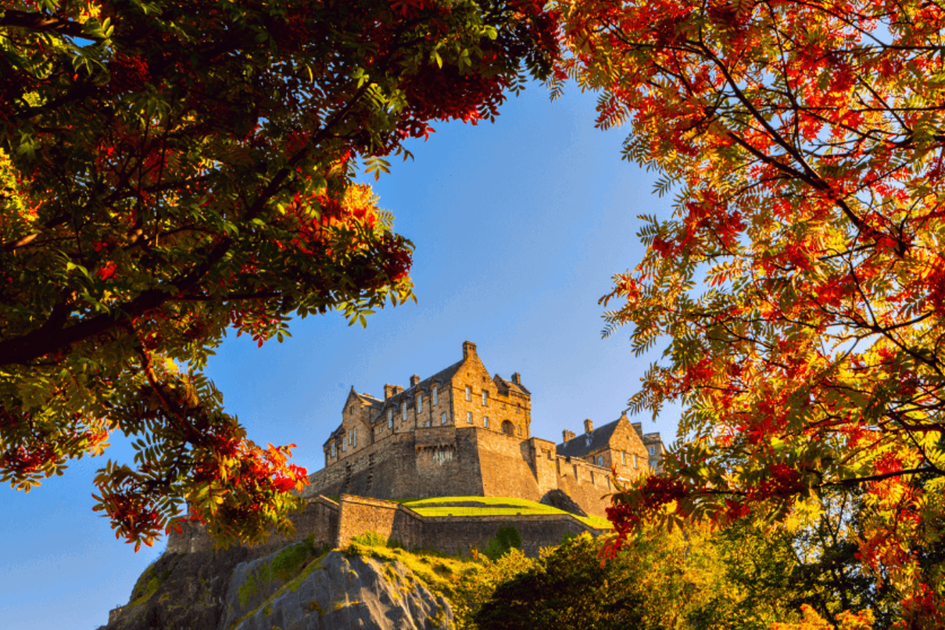 Nằm sừng sững trên đỉnh núi đá lửa Castle Rock, lâu đài Edinburgh là một trong những biểu tượng lịch sử nổi bật của Scotland và cũng là một trong những địa điểm du lịch mùa thu ở Anh Quốc hấp dẫn bậc nhất. Khi thu về, bầu trời trong xanh, không khí mát mẻ và ánh nắng vàng rực rỡ làm nổi bật thêm vẻ hùng vĩ của công trình lâu đời này.