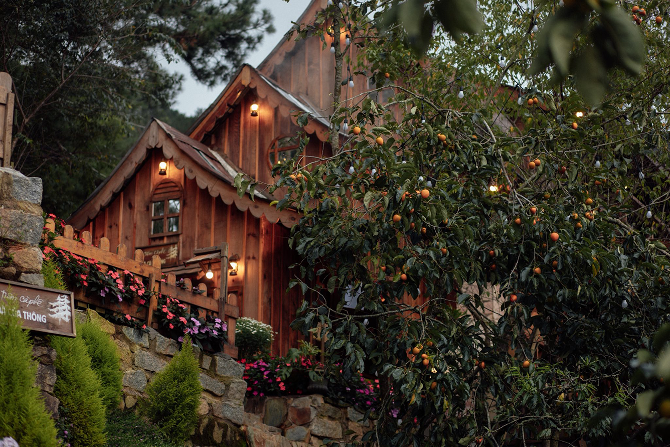 Không chỉ có view đẹp, quán còn gây ấn tượng với không gian mộc mạc: bàn gỗ, ghế tre, vài góc nhỏ decor theo phong cách vintage, đủ để bạn vừa nhâm nhi ly cà phê nóng, vừa cảm nhận sự bình yên đặc trưng của mùa thu Đà Lạt. Ngoài ra, khuôn viên cũng được sắp xếp khéo léo với nhiều góc check-in “đắt giá” như xe chở hồng hay vườn cẩm tú cầu. Nếu bạn đang tìm một quán cafe đẹp ở Đà Lạt 2025 vừa có góc chill, vừa có vườn hồng chín rực rỡ, thì Nhà của Thông chính là lựa chọn số một.