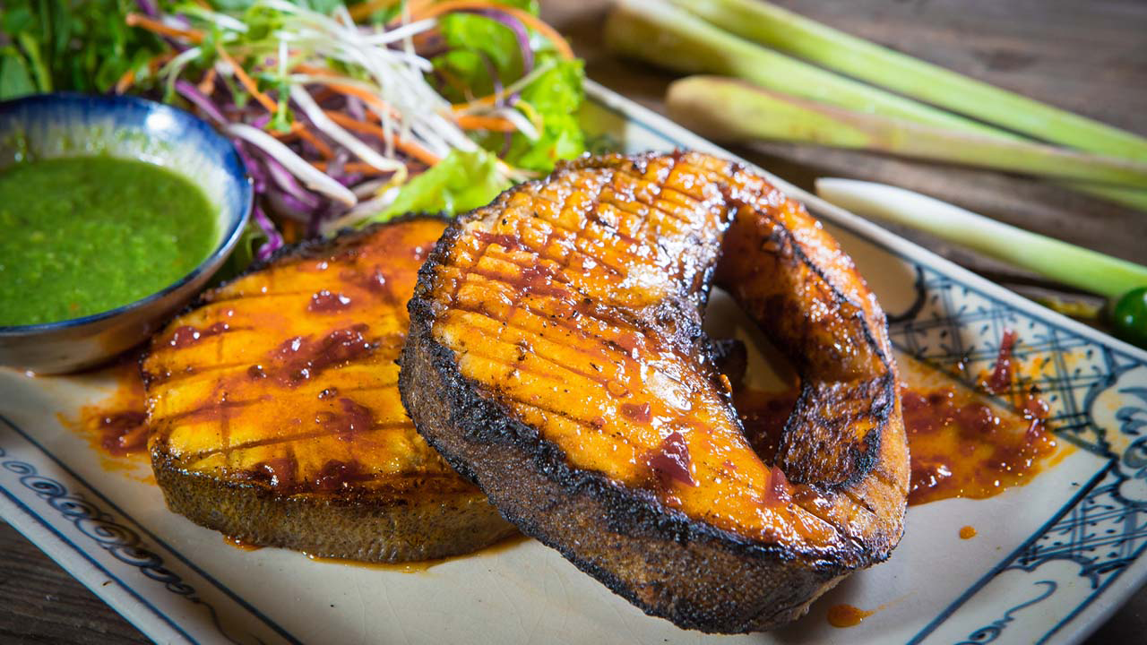 Buổi chiều ở biển, bạn có thể ngồi bên một quán nhỏ ven đường và gọi một phần cá nướng muối ớt xanh. Cá được nướng trên than hồng cho đến khi lớp da giòn rụm, thịt bên trong ngọt mềm, chấm cùng muối ớt xanh giã tay có vị chua thanh, cay nhẹ làm bật lên vị tươi rói của hải sản.