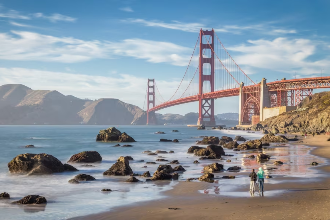 Không thể nhắc đến San Francisco mà bỏ qua Cầu Cổng Vàng – Golden Gate Bridge. Cây cầu biểu tượng này không chỉ là công trình kỹ thuật kỳ vĩ, mà còn là linh hồn của thành phố, là điểm hẹn đầu tiên trong mỗi chuyến du lịch hè ở San Francisco. Khi bình minh lên, làn sương mỏng từ vịnh len lỏi qua từng nhịp cầu, phủ một lớp màn mộng mị lên sắc cam rực rỡ. Cảm giác đi bộ hoặc đạp xe qua cầu, với gió lồng lộng và đại dương xanh ngắt bên dưới, là trải nghiệm khiến trái tim những người lữ khách đập nhanh hơn.