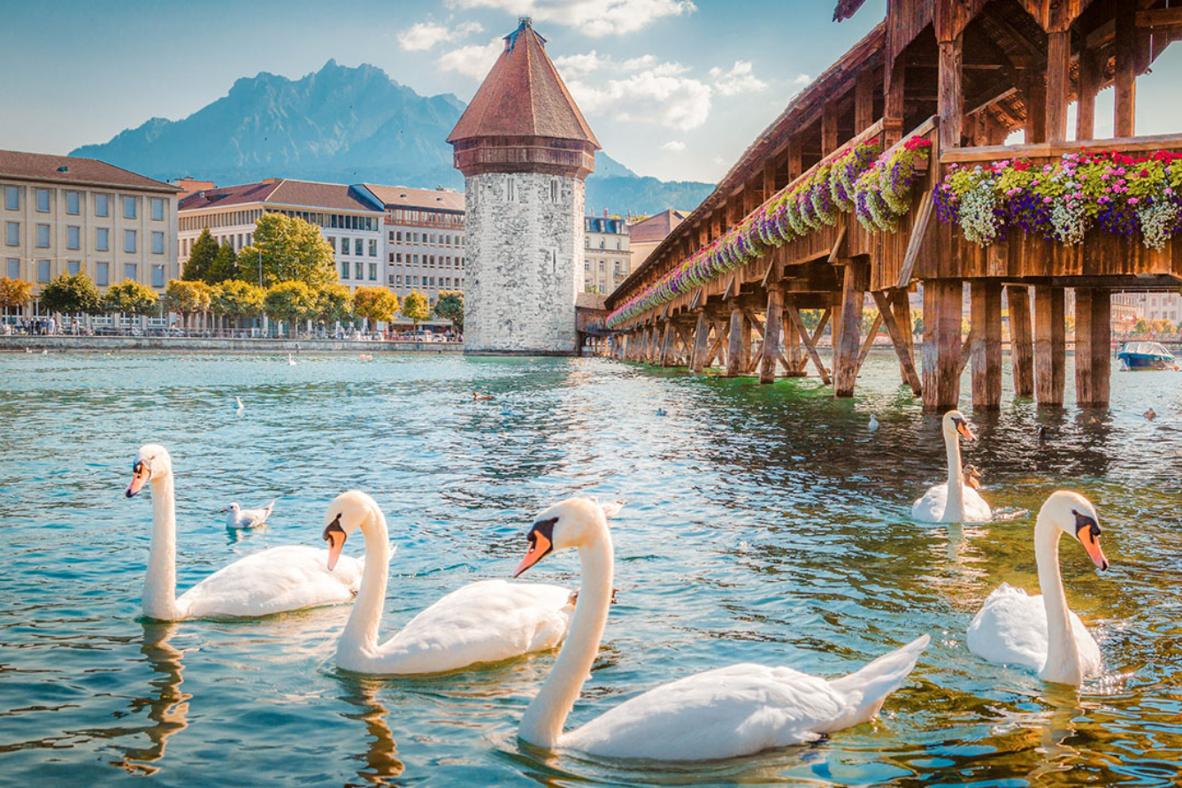 Khép lại hành trình du lịch Tây Âu mùa hè là Lucerne – viên ngọc bên hồ nước xanh biếc dưới chân dãy Alps. Lucerne như một bức tranh cổ tích sống động, nơi cầu gỗ Chapel Bridge phủ đầy hoa, tháp nước Mediaeval kiêu hãnh soi mình trên mặt hồ trong vắt.