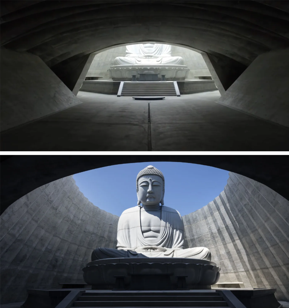 Để tiếp cận bức tượng Phật, du khách sẽ đi qua một đường hầm đá dài. Đầu hầm khá tối, gợi cảm giác thu mình, thiền định. Nhìn từ xa người ta chỉ thấy phần đỉnh đầu pho tượng, nhưng khi bước sâu hơn vào bên trong, bạn mới có thể chiêm ngưỡng toàn thân pho tượng này, và ánh sáng dần hé lộ vòm trời mở toang phía trước.