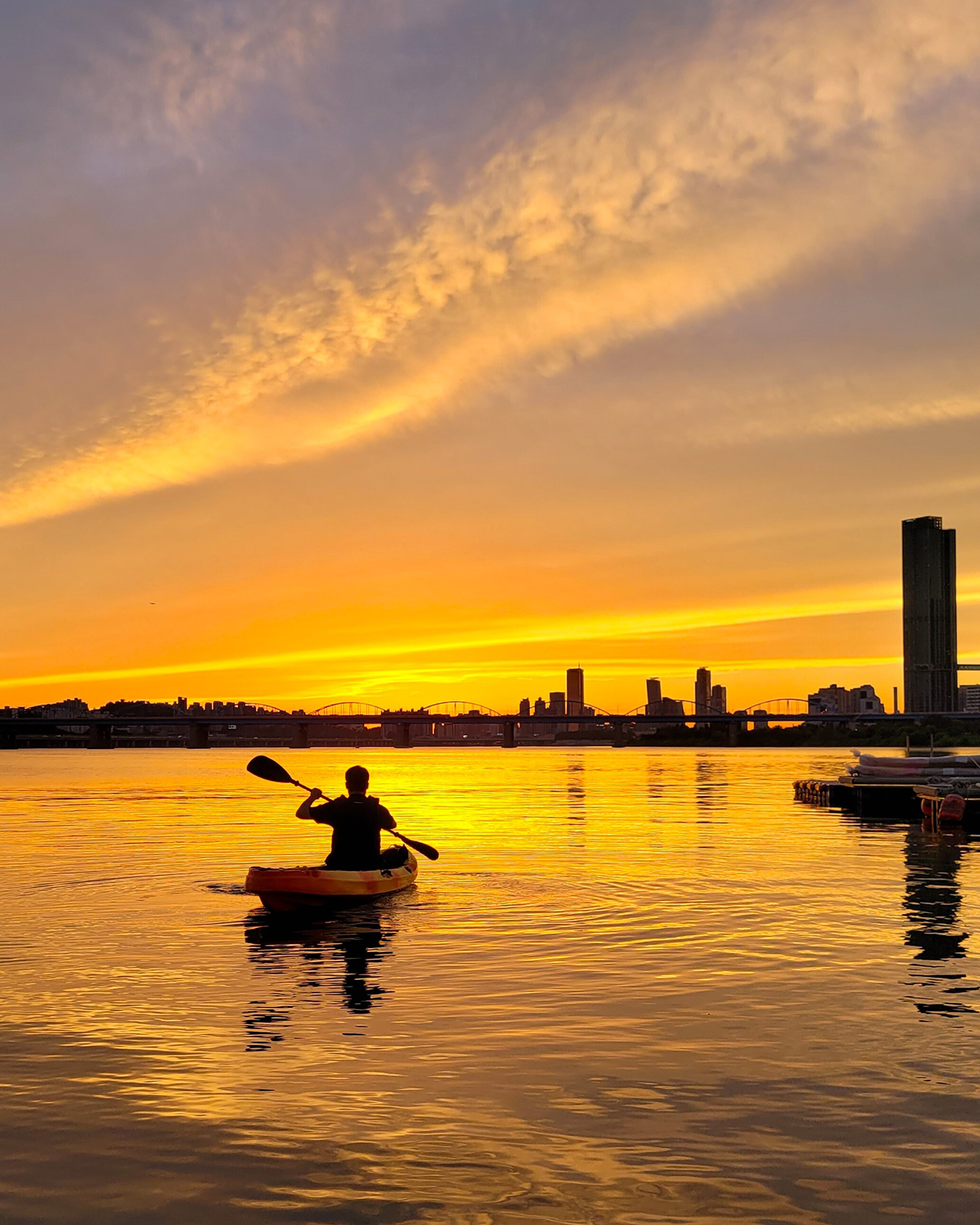 Hãy tưởng tượng: bạn ngồi trên chiếc kayak nhẹ lướt, phía trước là mặt trời đang dần khuất sau những tòa nhà cao tầng, phản chiếu ánh cam đỏ xuống mặt sông. Không tiếng còi xe, không ồn ào phố thị mà chỉ có làn nước lăn tăn, làn gió nhẹ mơn man, và người bạn đồng hành bên cạnh.- Địa điểm gợi ý: Ttukseom Hangang Park (khu kayak nổi tiếng)