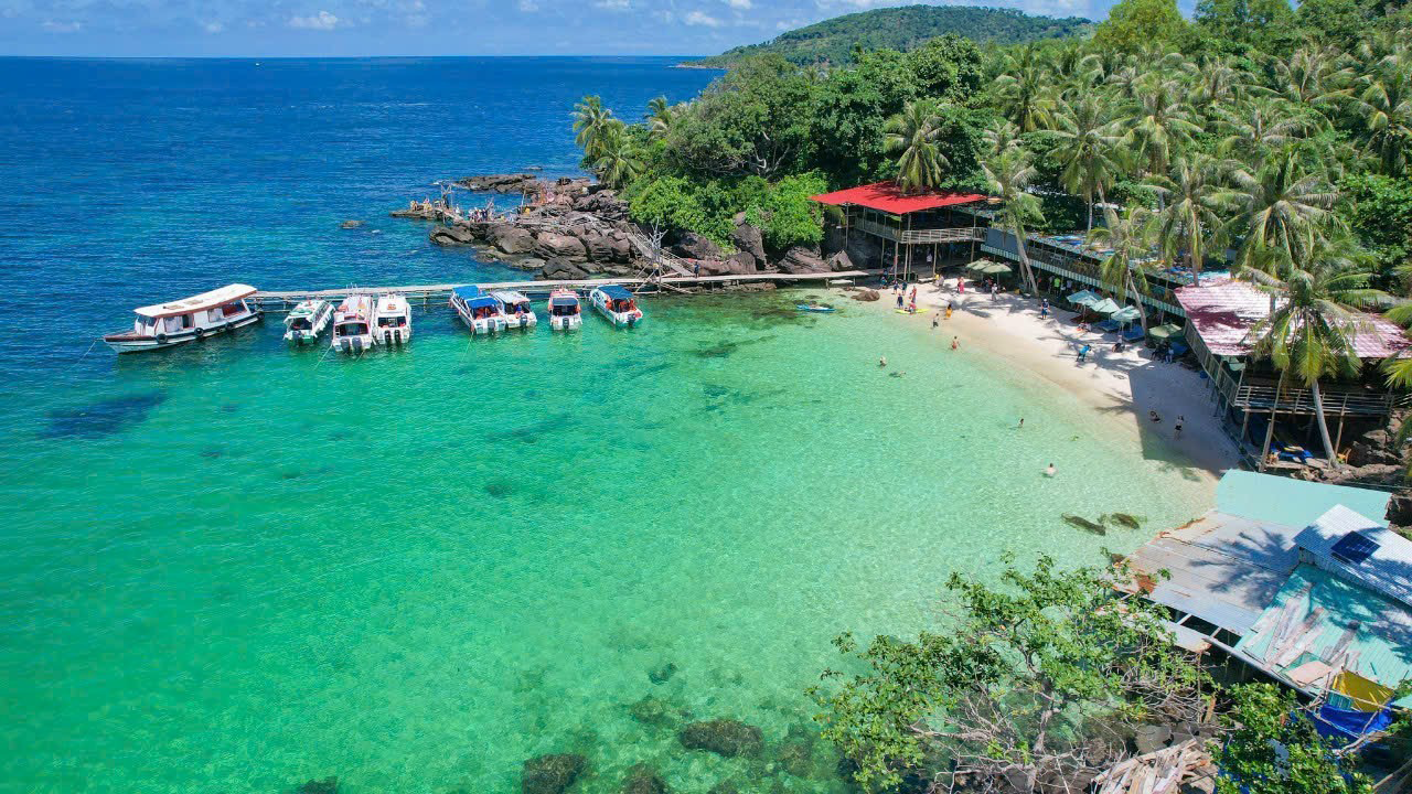 Từ trên cao nhìn xuống, Hòn Thơm hiện lên như một tấm lụa xanh giữa biển trời Tây Nam, mang đến cảm giác thư thái ngay từ ánh nhìn đầu tiên.