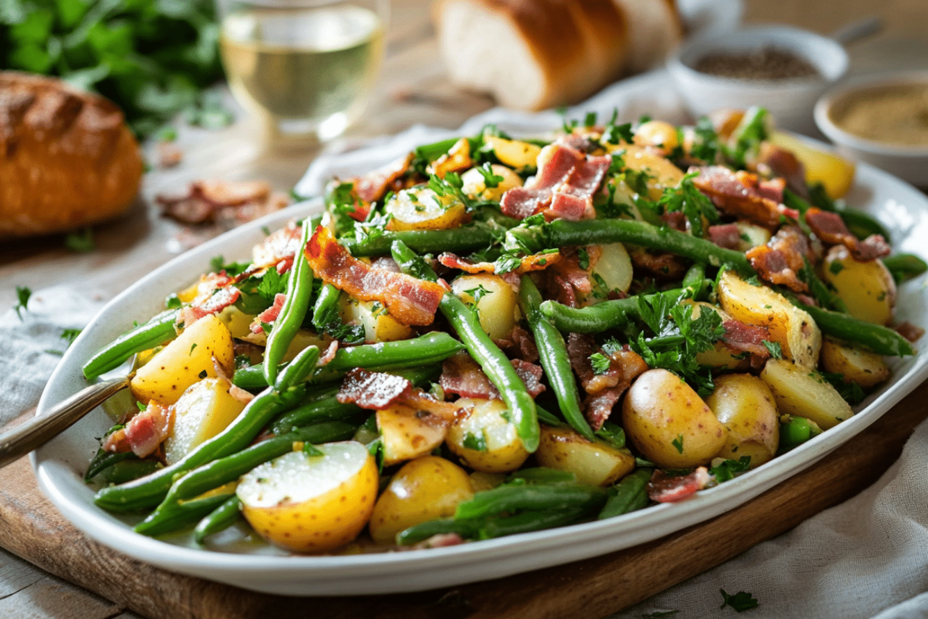 Nhắc đến món ăn mùa hè ở Bỉ, không thể không kể đến Salade Liégeoise – một món salad ấm áp nhưng vẫn mát lành, phản ánh hoàn hảo sự hào sảng và mộc mạc của người dân vùng Wallonia. Salade Liégeoise là sự kết hợp khéo léo giữa đậu xanh non mơn mởn, khoai tây luộc nóng hổi, hành tím thái mỏng và bacon chiên giòn rụm. Món ăn tưởng chừng đơn giản nhưng lại mang theo cả một câu chuyện mùa hè: cánh đồng khoai tây vàng óng dưới nắng, những luống đậu xanh mướt đẫm sương và bếp lửa gia đình lúc chiều muộn.