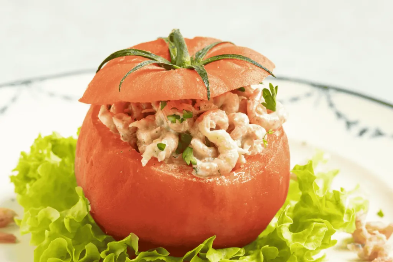 Tomates Crevettes là sự kết hợp tinh tế giữa thiên nhiên và bàn tay con người. Những quả cà chua chín mọng được khoét rỗng, nhồi đầy hỗn hợp tôm bóc vỏ tươi ngọt trộn cùng sốt mayonnaise làm thủ công, thơm nhẹ mùi mù tạt và gia vị vườn. Đĩa Tomates Crevettes khi dọn ra là một bức tranh rực rỡ: đỏ của cà chua, hồng nhạt của tôm, xanh tươi của rau mùi trang trí.