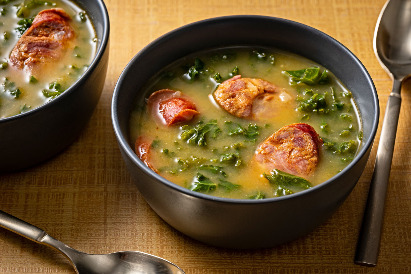 Món ăn mùa hè ở Bồ Đào Nha này được làm từ khoai tây nghiền nhuyễn ninh trong nước dùng trong vắt, tạo thành chất lỏng sánh mịn như nhung. Rau cải gallega (couve galega) được thái chỉ mỏng manh như sợi tơ xanh, thả vào nồi để giữ nguyên màu tươi mát. Những lát chouriço – xúc xích paprika đỏ rực – nổi bật trong nền xanh vàng, toả mùi thơm cay nhẹ đặc trưng.