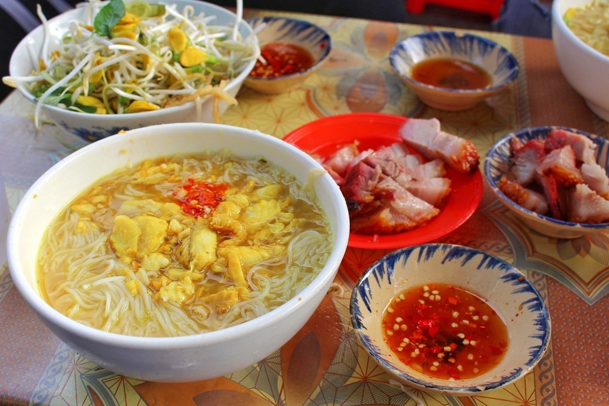 Đây là món nước miền Tây rất phổ biến, có nguồn gốc từ Campuchia nhưng đã được người miền Tây biến tấu cho hợp khẩu vị Việt. Một tô đầy đủ có thịt heo lát mỏng, gan, tôm, trứng cút, thịt bằm xào, hành phi và cả tỏi phi thơm lừng.