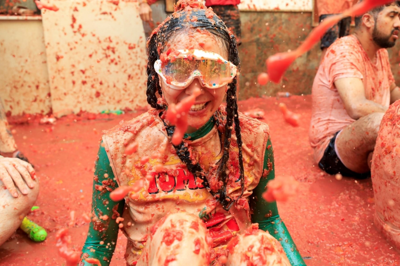 Khi tín hiệu vang lên, mọi người bắt đầu ném cà chua vào nhau. Không có đối thủ hay đội nhóm, tất cả chỉ đơn giản là vui hết mình. Trong vòng một tiếng đồng hồ, cả thị trấn chìm trong sắc đỏ, quần áo, tóc tai và thậm chí cả kính mát cũng bị nhuộm màu cà chua.
