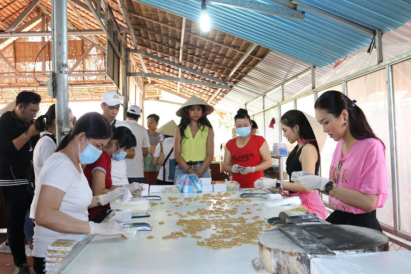 Tiếp nối hành trình trải nghiệm là hoạt động làm kẹo dừa tại các làng nghề truyền thống. Từ khâu nạo dừa, nấu nước cốt, cho đến gói và đóng thành phẩm – tất cả đều được thực hiện thủ công. Đây không chỉ là trải nghiệm thú vị, mà còn là cách để du khách hiểu hơn về đời sống và văn hoá lao động của người dân Vĩnh Long.