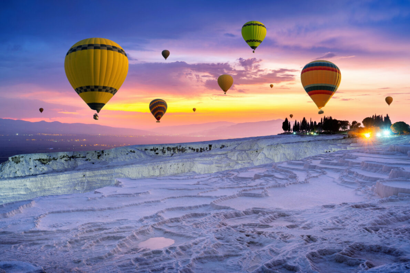 Nếu như Cappadocia là “ngôi sao sáng” trong bản đồ khinh khí cầu thì Pamukkale lại mang đến một trải nghiệm ngắm khinh khí cầu ở Thổ Nhĩ Kỳ đầy bất ngờ với bối cảnh hoàn toàn khác biệt. Tên gọi “Pamukkale” trong tiếng Thổ Nhĩ Kỳ có nghĩa là “Lâu đài bông”, đúng như vẻ ngoài trắng muốt và mềm mại của khu vực này. Địa danh này nổi tiếng với những tầng đá vôi được hình thành từ nước suối khoáng nóng giàu canxi, tạo thành các hồ nước nhỏ phản chiếu ánh sáng như những tấm gương thiên nhiên.