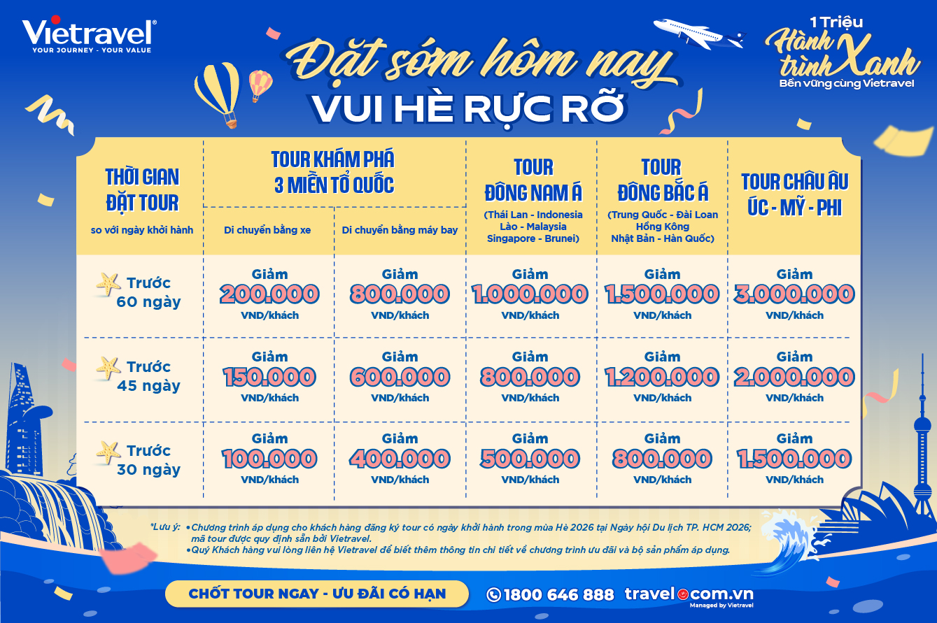 Chương trình đặt tour sớm dành cho mùa hè cũng được Vietravel đẩy mạnh nhằm khuyến khích khách hàng chủ động lên kế hoạch từ sớm. Ở góc độ trải nghiệm, việc đặt sớm giúp giảm chi phí tổng thể nhưng vẫn đảm bảo chất lượng. Chẳng hạn với các tuyến Đông Bắc Á, du khách có thể nhận ưu đãi lên đến 1.500.000 đồng khi đặt trước 60 ngày, tương đương mức tiết kiệm khoảng 25.000 đồng cho mỗi ngày khi lên kế hoạch sớm hơn.
