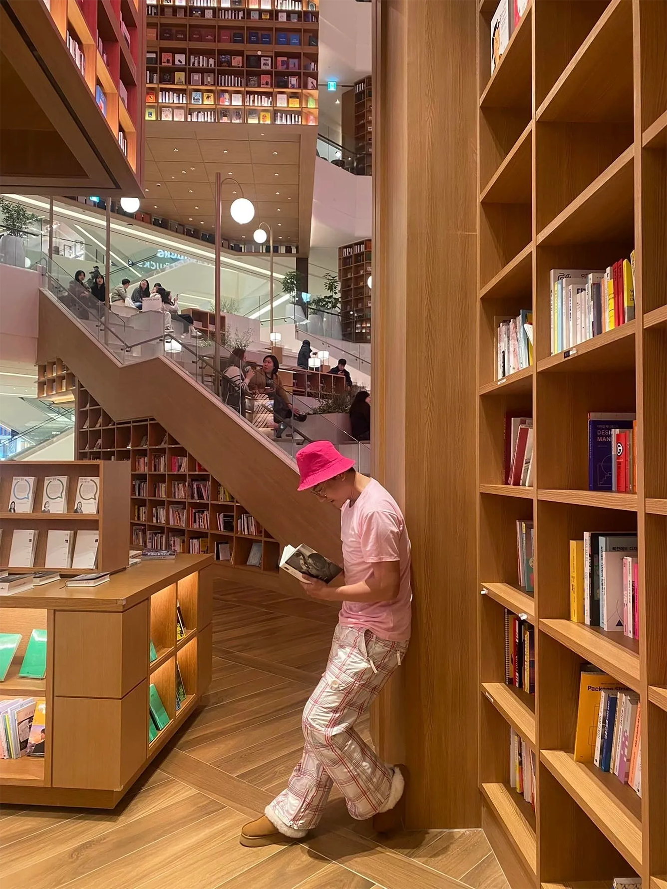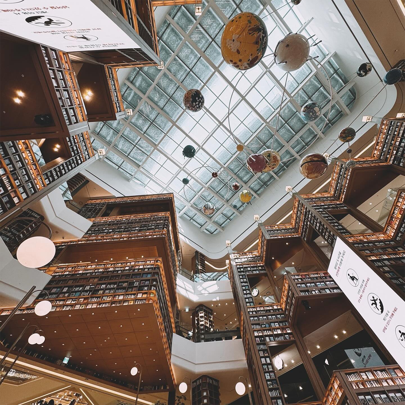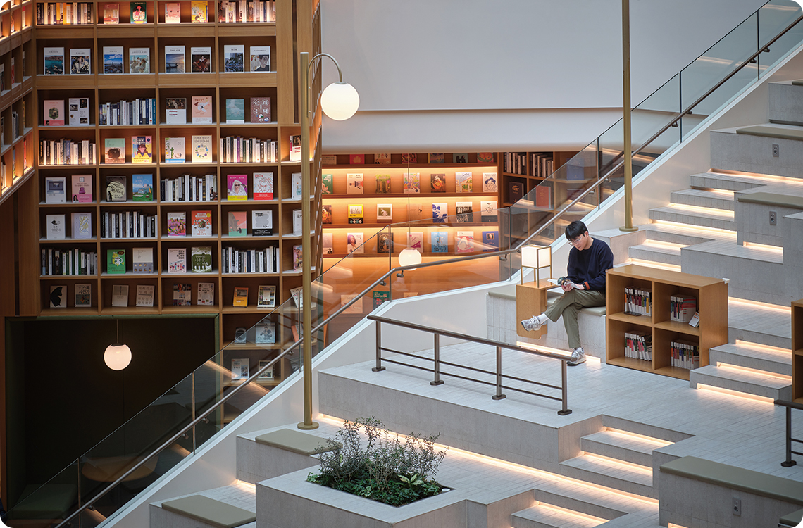 Không gian mở với thiết kế tinh tế này giúp tạo ra trải nghiệm vừa thân thiện vừa sang trọng. Ánh sáng tự nhiên tràn ngập qua mái kính, hòa cùng ánh đèn vàng ấm áp, làm nổi bật màu sắc của hàng nghìn cuốn sách được trưng bày. Đây không chỉ là nơi đọc sách mà còn là điểm đến văn hóa, giải trí và là một trong những điểm check-in Suwon đẹp nhất hiện nay.