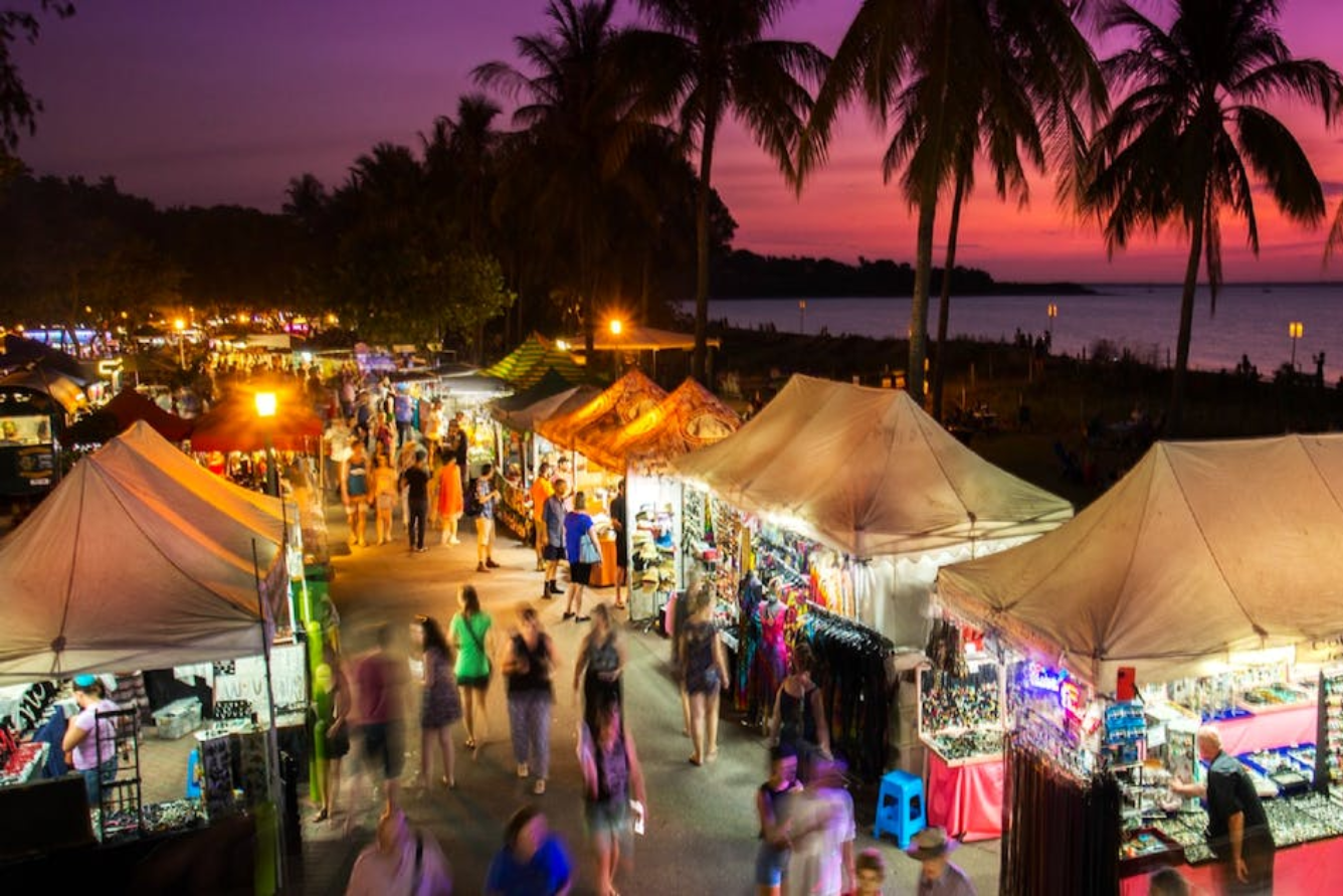 Khi nhắc đến các địa điểm du lịch mùa hè Darwin, không thể không nhắc đến chợ đêm Mindil Beach – nơi hội tụ của văn hóa, ẩm thực và cộng đồng địa phương. Chợ chỉ hoạt động vào các buổi tối thứ Năm và Chủ Nhật từ tháng 4 đến tháng 10, đúng vào mùa hè, và thường thu hút hàng ngàn du khách đến để thưởng thức ẩm thực đa dạng, mua sắm đồ thủ công mỹ nghệ và thư giãn bên bờ biển.