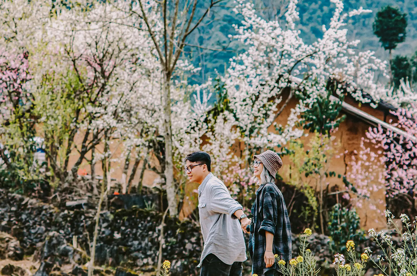 Đầu xuân (tháng 2-3) là thời điểm các bản làng vùng cao khoe sắc hoa đào, hoa mận, hoa lê trên khắp triền núi và ven lối đi. Dọc theo những con đường nhỏ uốn lượn, sắc hoa hồng phớt, trắng tinh khôi hòa cùng màu xanh non của núi rừng tạo nên khung cảnh vừa yên bình vừa thơ mộng. Buổi sáng sớm, sương mù còn lảng bảng trên mái nhà và sườn đồi, khiến Hà Giang hiện lên mờ ảo và cuốn hút.