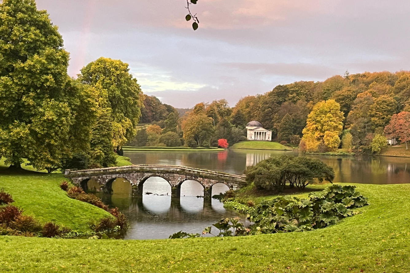 Stourhead, nằm ở hạt Wiltshire, là một trong những khu vườn cảnh nổi tiếng nhất nước Anh và cũng là địa điểm ngắm lá vàng ở Anh được giới thiệu trong nhiều bộ phim cổ điển. Nổi bật với hồ nước nhân tạo rộng lớn, bao quanh là những công trình kiến trúc cổ điển như đền thờ Pantheon, cây cầu đá và các ngôi đền nhỏ, Stourhead mang đến không gian kết hợp hoàn hảo giữa thiên nhiên và nghệ thuật.