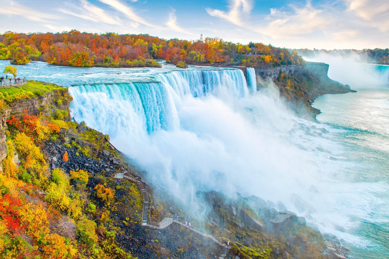 Một trong những biểu tượng thiên nhiên của du lịch Mỹ chính là thác Niagara. Vào mùa thu, thác nước hùng vĩ này được bao quanh bởi rừng cây chuyển màu, tạo nên khung cảnh vừa mạnh mẽ vừa lãng mạn. Ngoài việc chiêm ngưỡng thác nước từ các điểm quan sát, du khách còn có thể tham gia các chuyến du thuyền để tiến gần hơn và cảm nhận sức mạnh của thiên nhiên.