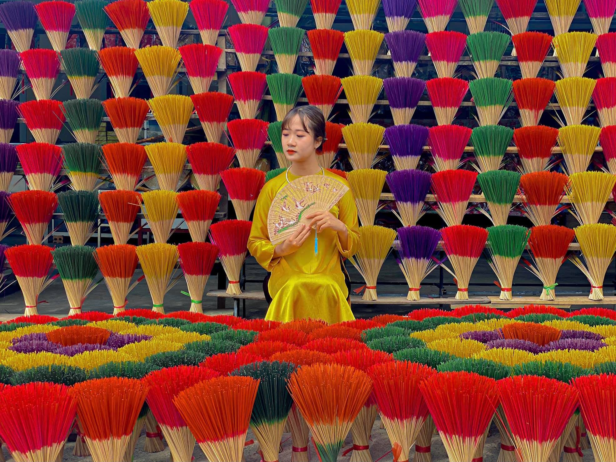 Trong hành trình du lịch làng hương Thuỷ Xuân, chắc chắn bạn sẽ không muốn bỏ lỡ cơ hội check-in giữa không gian đầy sắc màu của những bó hương rực rỡ. Dưới ánh nắng miền Trung chan hòa, từng hàng hương được phơi khéo léo theo hình nan quạt tạo nên một khung cảnh sống ảo cực kỳ cuốn hút. Đặc biệt, nhiều du khách chọn thuê áo Nhật Bình hoặc áo dài truyền thống để chụp ảnh ở làng hương, vừa tôn lên vẻ đẹp dịu dàng, vừa lưu giữ lại những khoảnh khắc độc đáo khi trải nghiệm Huế. Đây thực sự là địa điểm sống ảo Huế lý tưởng cho các tín đồ đam mê nhiếp ảnh và khám phá văn hoá.