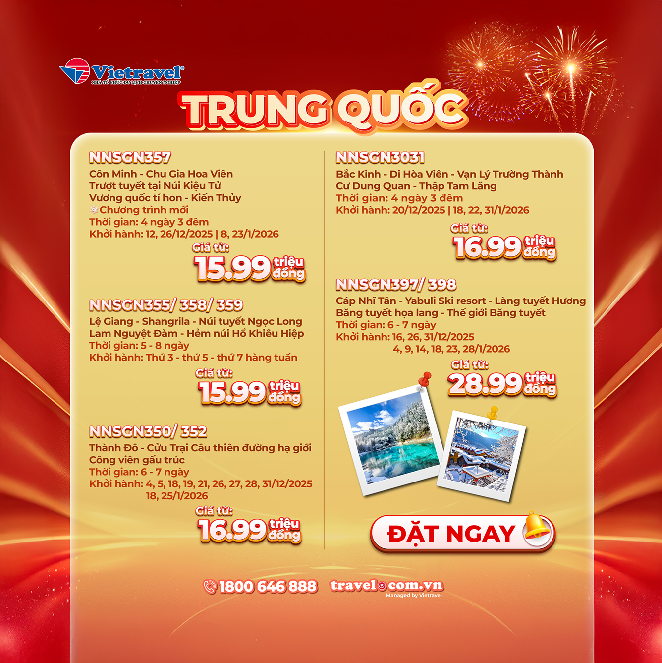 Khám phá những khu trượt tuyết không chỉ là hành trình tìm kiếm cảm giác hồi hộp, mà còn là cơ hội để bạn hòa mình vào cảnh sắc tuyệt đẹp của núi non hùng vĩ. Hãy cùng Vietravel trải nghiệm những khoảnh khắc đáng nhớ trong hành trình tour du lịch Trung Quốc mùa đông, từ những làn tuyết trắng xoá đến những bữa tiệc ẩm thực đặc sắc nhé!