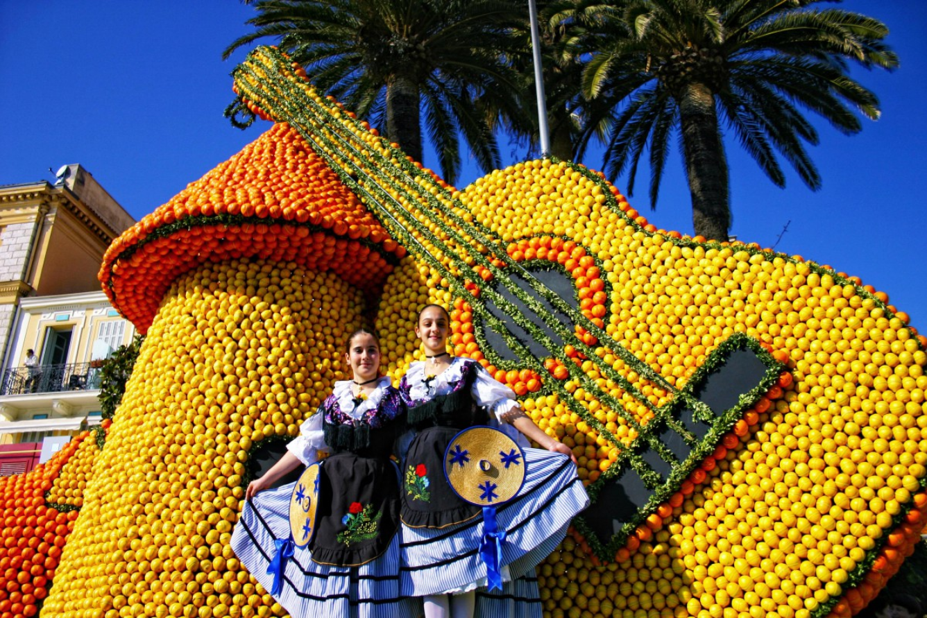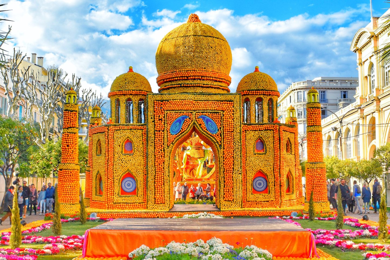 Menton, thành phố nhỏ nằm giữa Pháp và Ý, nổi tiếng với lễ hội ở Pháp đặc sắc mang tên Fête du Citron – Lễ hội Cánh Hoa. Mỗi năm, vào tháng Hai, hàng tấn chanh và cam được dùng để tạo nên những tác phẩm nghệ thuật khổng lồ: cung điện, tượng thần, xe hoa diễu hành… tất cả đều rực rỡ sắc vàng.