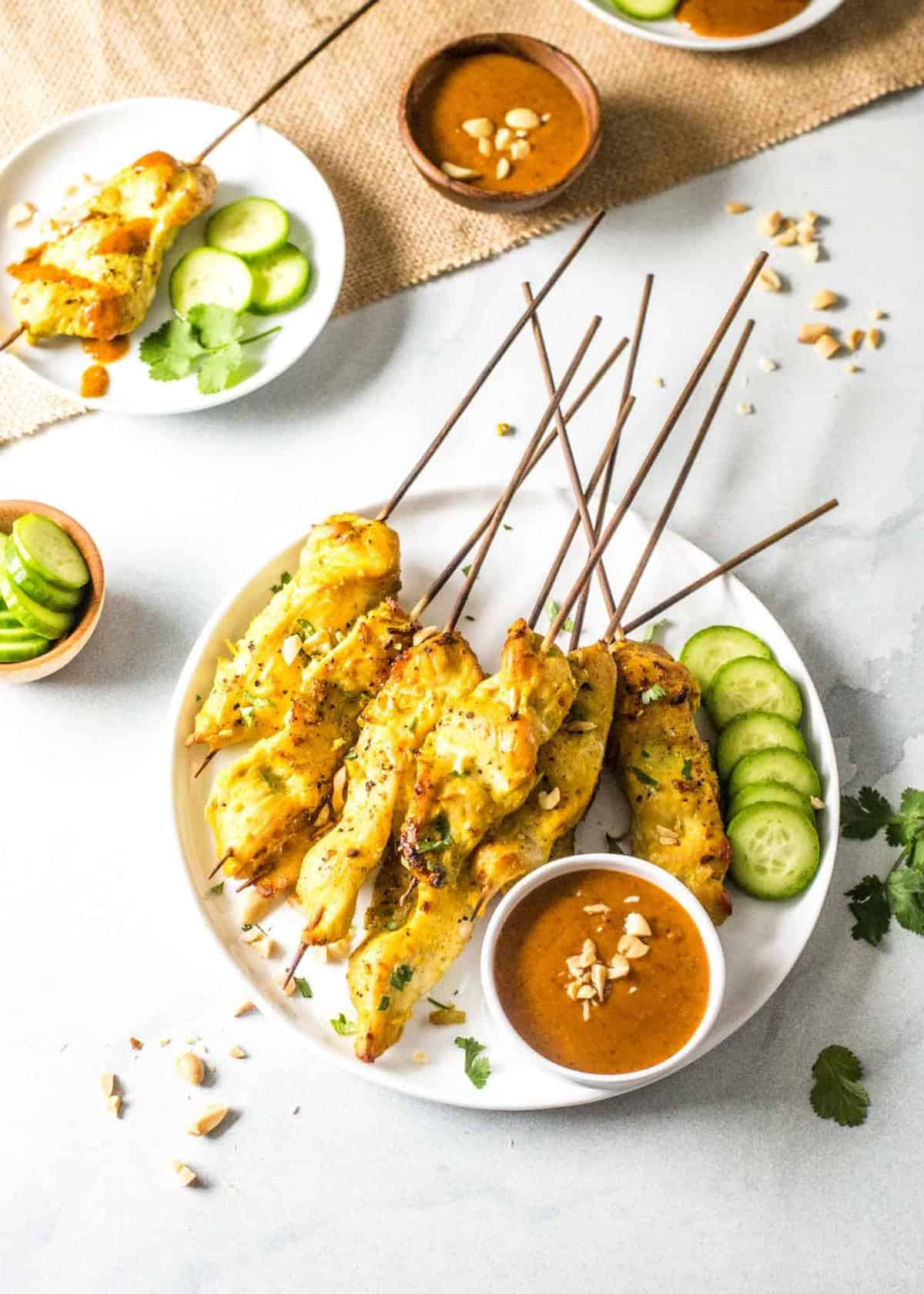 Satay gồm thịt gà, heo hay cá xiên que, ướp gia vị rồi nướng thơm. Khi ăn, bạn chấm với sốt đậu phộng bùi béo, kèm dưa leo chua dịu – rất hợp khi dùng như món khai vị hoặc ăn nhẹ.