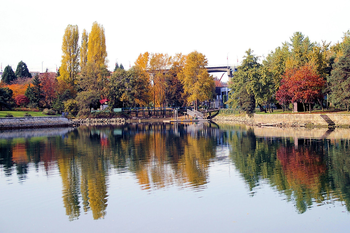 False Creek là một trong những khu vực đẹp nhất Vancouver để cảm nhận sự kết hợp giữa thiên nhiên và đô thị hiện đại. Khi thu về, tuyến đường ven vịnh False Creek được bao phủ bởi sắc đỏ và vàng của cây lá, phản chiếu trên mặt nước xanh biếc tạo nên cảnh quan quyến rũ.