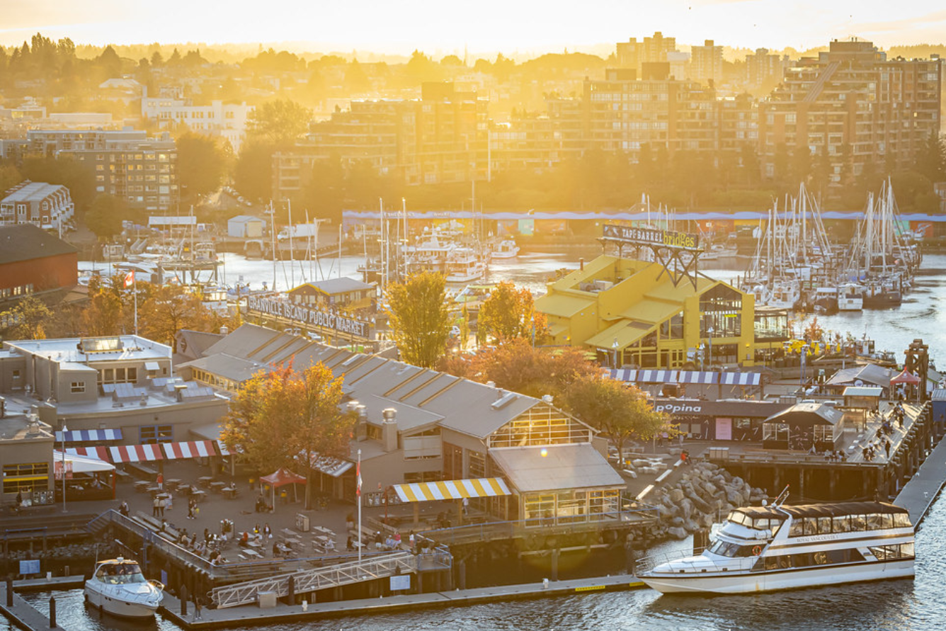 Khám phá thành phố Vancouver mùa thu tại Granville Island, du khách có thể ghé thăm Granville Island Public Market – nơi bày bán các loại trái cây, rau củ mùa thu, các món ăn đặc sản và quà lưu niệm thủ công. Không khí nơi đây vừa nhộn nhịp, vừa gần gũi, tạo cảm giác ấm áp giữa tiết trời se lạnh. Granville Island cũng là điểm lý tưởng để tận hưởng một buổi tối ấm cúng bên ly rượu vang địa phương.