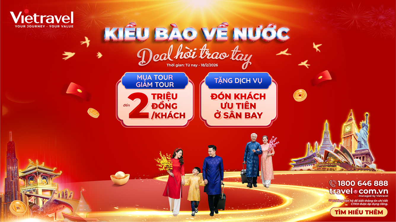 Vietravel dành những ưu đãi đặc biệt cho Kiều Bào trở về quê hương dịp Tết 2026, giúp hành trình sum họp trở nên trọn vẹn hơn với chính sách hỗ trợ đặt tour linh hoạt, mức giá ưu đãi cho nhóm gia đình và các dịch vụ tặng kèm theo từng chương trình.