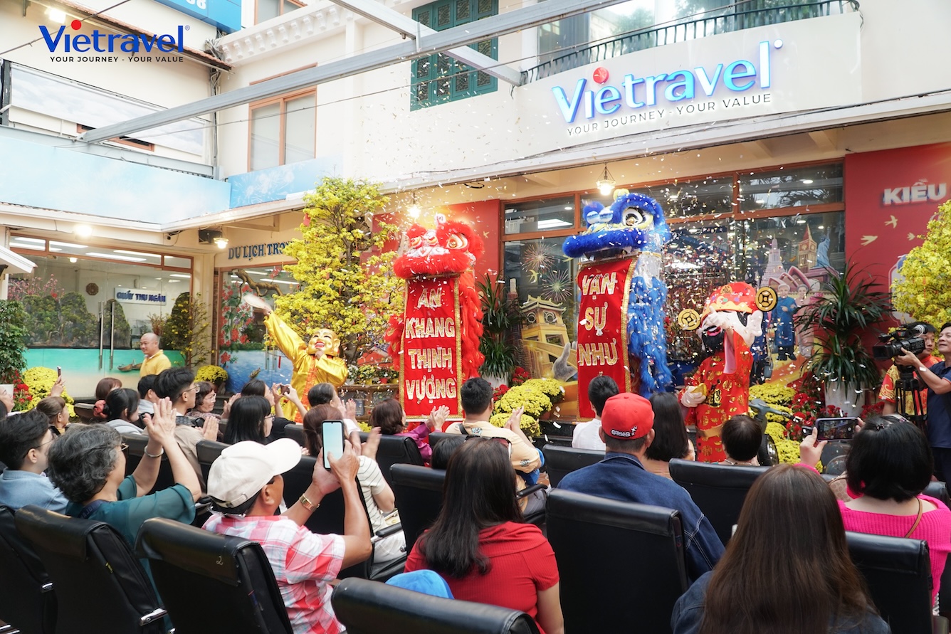 Sáng Mùng 1 Tết, trong không khí hân hoan của ngày đầu năm mới, Công ty Cổ phần Du lịch Vietravel tổ chức Lễ xuất hành đầu năm cho các đoàn khách du xuân Bính Ngọ, mở ra những chuyến đi khắp Việt Nam và quốc tế với nhiều kỳ vọng may mắn, khởi sắc. Ngay từ sáng sớm, đông đảo du khách đã có mặt tại Trụ sở chính (190 Pasteur, P. Xuân Hòa, TP.HCM) để cùng gia đình tận hưởng không gian rộn ràng sắc xuân và theo dõi màn biểu diễn lân – sư – rồng mang ý nghĩa tài lộc, thịnh vượng và bình an. Đặc biệt, du khách xuất hành tour vào Mùng 1 Tết nhận “Lộc Xuân Vinh Hoa Phú Quý” – những phong bao lì xì may mắn như lời chúc sức khỏe, hạnh phúc và vạn sự như ý. Không khí sum vầy, những nụ cười và lời chúc trao nhau đã góp phần tạo nên một điểm khởi hành đầu năm ấm áp và nhiều cảm hứng.
