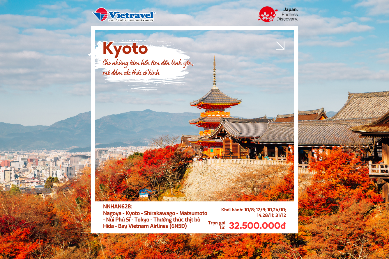 Mùa thu đến, Kyoto như được nhuộm vàng bởi những hàng cây. Những địa điểm như Chùa Vàng, Chùa Thanh Thủy,... trở thành thiên đường nhiếp ảnh với sắc thu rực rỡ hòa cùng nét cổ kính trầm mặc. Đây là điểm đến lý tưởng cho những tâm hồn tìm đến sự tĩnh tại, muốn lắng nghe nhịp đập chậm rãi của cuộc sống giữa dòng chảy thời gian.
